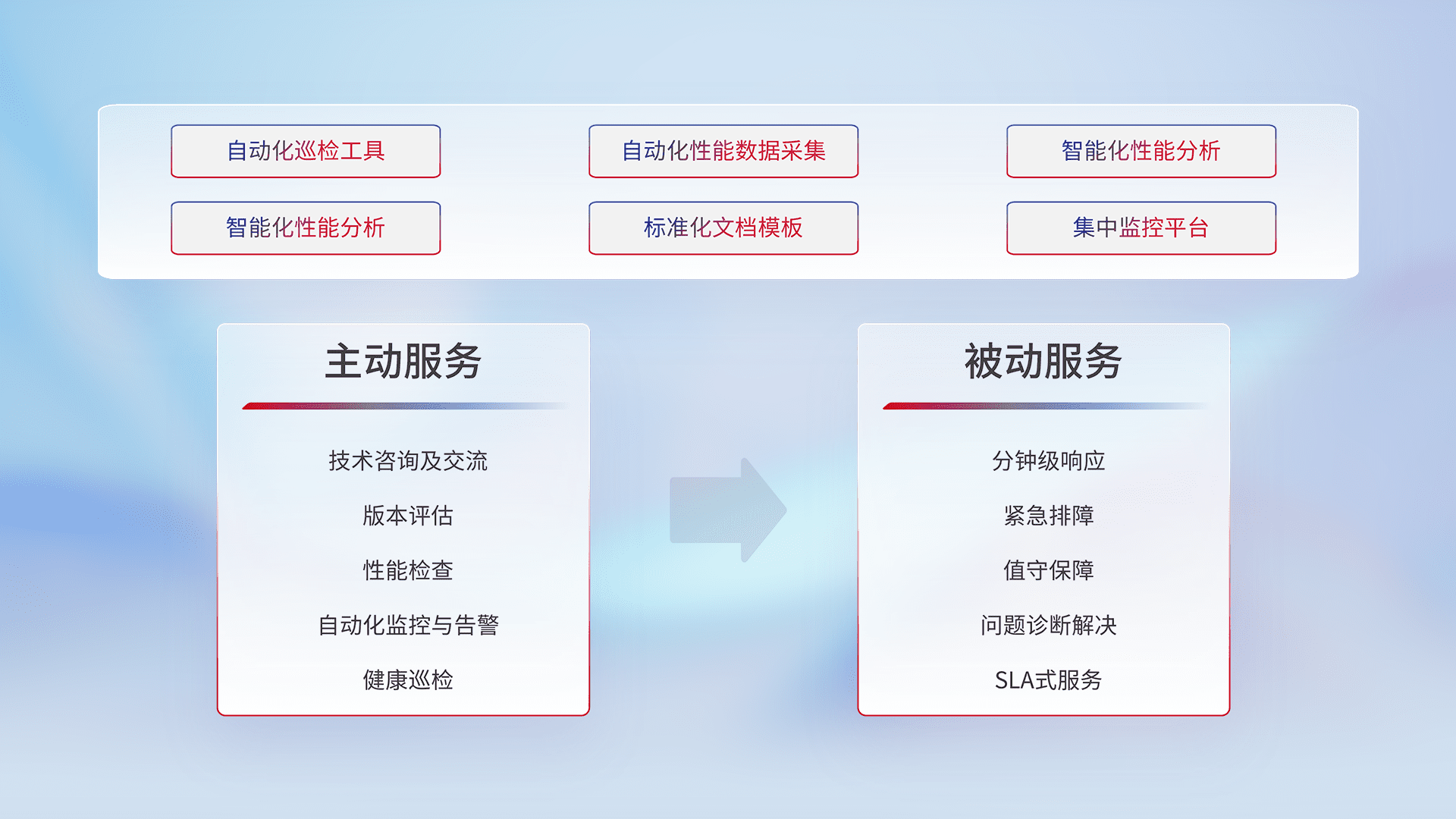 智能化工具和标准化文档,,,保障服务质量,,,,提供主动服务(包含技术咨询、、、版本评估、、性能检查、、、自动化监控与告警、、健康巡检)和被动服务包含(分钟级响应、、、紧急排障、、值守保障、、问题诊断解决、、、、SLA服务)。。。